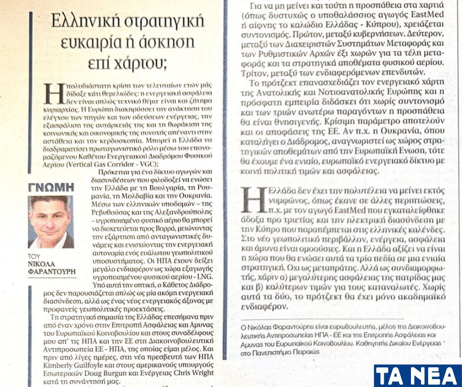 Φαραντούρης για Κάθετο Διάδρομο: «Ενέργεια, Ασφάλεια και Άμυνα» πάνε πακέτο»