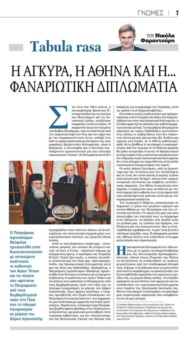 Οι κινήσεις αυτές αναδεικνύουν μια πραγματικότητα: ενώ η Τουρκία επενδύει στη διαμεσολάβηση και στην εκκλησιαστική διπλωματία, η Ελλάδα εμφανίζεται απούσα ή με καθυστερημένα αντανακλαστικά. Τα παλαίφατα Πατριαρχεία εδρεύουν σε χώρες Ορθόδοξων κοινοτήτων στις οποίες οι κυβερνήσεις εκεί δεν διάκεινται πάντα φιλικά, απεναντίας (βλ. διώξεις και σφαγές στη Συρία). Αν η Αθήνα καθυστερεί, κάθε άλλη βοήθεια ή συνδρομή ή συμπαράσταση από την Άγκυρα (ή τη Μόσχα) μοιραία θα έρθει να καλύψει το κενό. Οι θρησκευτικοί ανταγωνισμοί είναι γνωστοί και καταδεικνύουν ότι η θρησκευτική/εκκλησιαστική διπλωματία δεν είναι ζήτημα του παρελθόντος αλλά πεδίο στρατηγικού διαγκωνισμού στο παρόν.