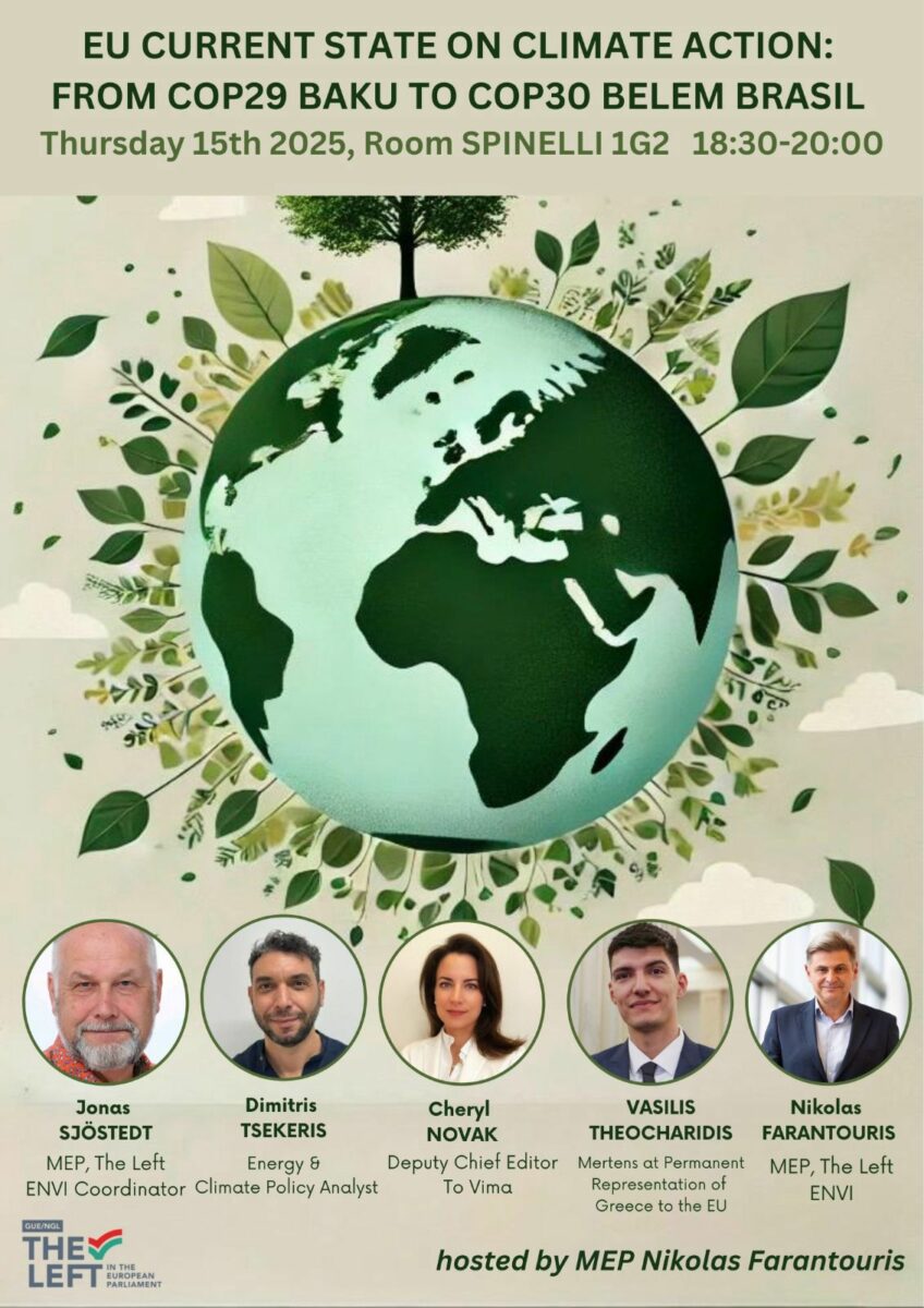 19 Μαΐου, 2025Με πρωτοβουλία του Ευρωβουλευτή της Αριστεράς και Καθηγητή Ευρωπαϊκού Δικαίου Νικόλα Φαραντούρη, πραγματοποιήθηκε την Πέμπτη απόγευμα στο Ευρωπαϊκό Κοινοβούλιο στις Βρυξέλλες μεγάλη εκδήλωση με τίτλο «Η ΕΕ και η Κλιματική Δράση: Από το Μπακού στο Μπελέμ».