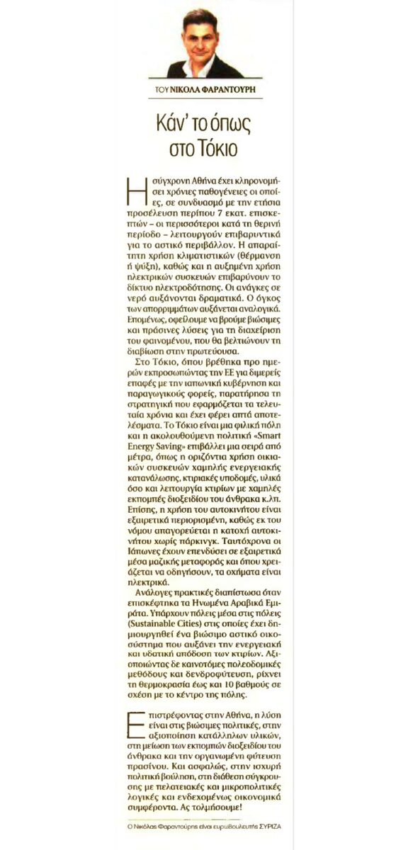 Στο Τόκιο, όπου βρέθηκα προ ημερών εκπροσωπώντας την ΕΕ για διμερείς επαφές με την ιαπωνική κυβέρνηση και παραγωγικούς φορείς, παρατήρησα τη στρατηγική που εφαρμόζεται τα τελευταία χρόνια και έχει φέρει απτά αποτελέσματα.